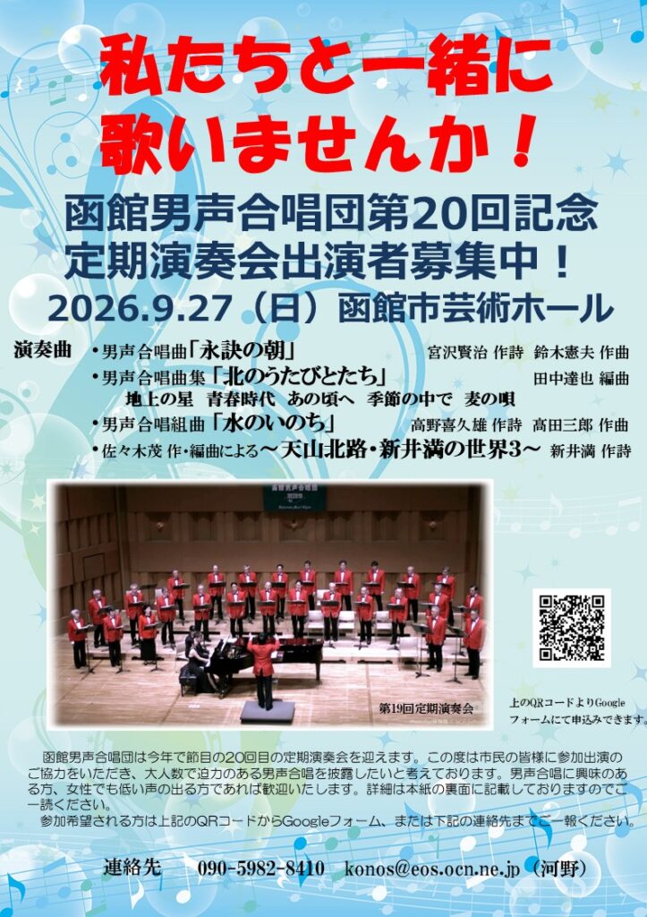 私たち函館男声合唱団は2005年の創立以来、毎年定期演奏会を重ねてまいりまして、今年で20回目を迎えることになりました。今回は一般の男声合唱曲のほかに地元を代表するアーティストの新井満先生の詩に函館を代表する作曲家の佐々木茂先生に作曲を委嘱した作品を演奏します。節目の記念定期演奏会ですので、大人数で歌いあげて迫力のある演奏会にするべく、広く一般市民からの参加希望者を募っております。希望するステージだけでも結構ですので、ご協力のほどよろしくお願いいたします。